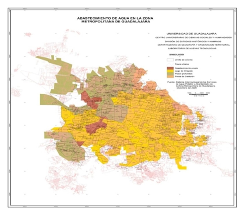 Gran parte de la ciudad, aproximadamente el 70 por ciento, es abastecida por agua proveniente del Lago de Chapala y del Río Santiago, el norte-oriente, recibe agua de la presa Calderón y la presa de El Salto, el poniente toma agua de pozos profundos de Tesistán y Colomos y el sur-poniente de otro sistema de pozos, como el acuífero de Toluquilla.